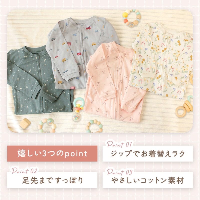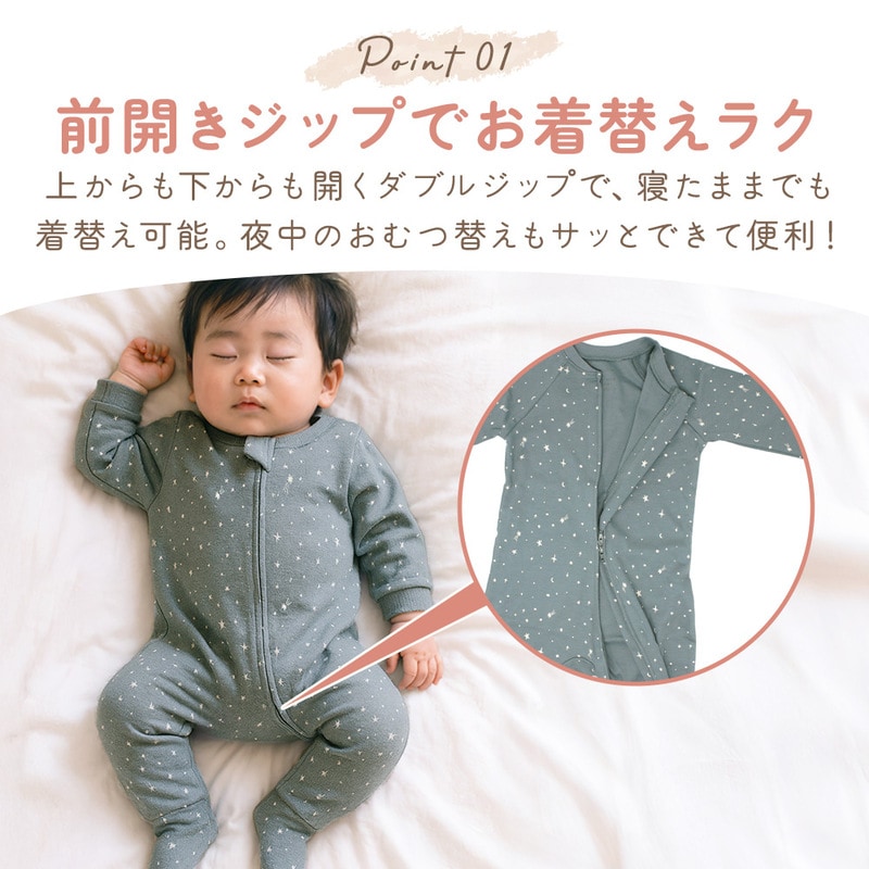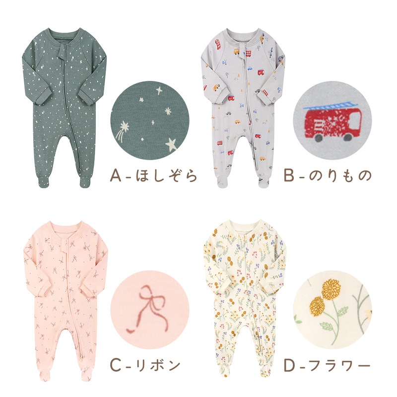 ジップアップロンパース A-ほしぞら 73cm ベビー 足つき カバーオール ロンパース 長袖 コットン 首元 ファスナー カバー付き 足付き 前開き ジップ 男の子 女の子 柔らか ナチュラル 着脱便利 ベビーロンパース パジャマ 長袖ロンパース 赤ちゃん ベビー服 かわいい ボディ