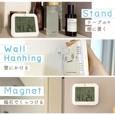 デジタル温湿度計 温湿度計 デジタル 高精度 温度計 湿度計 時計 付 室温計 赤ちゃん ベビー 小型 時計機能 温度 測定器 置きスタンド キャンプ マグネット 壁掛け 予防 熱中症対策 新生活 室内 おしゃれ かわいい ミニ ホワイト