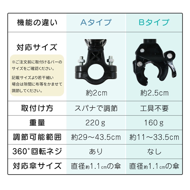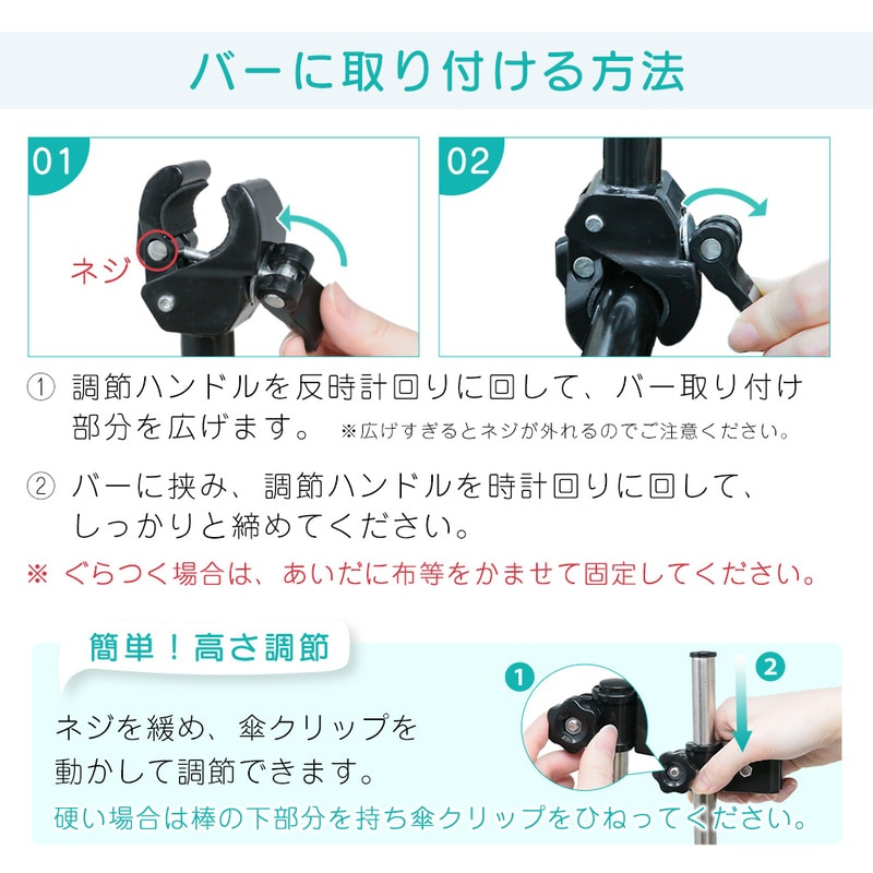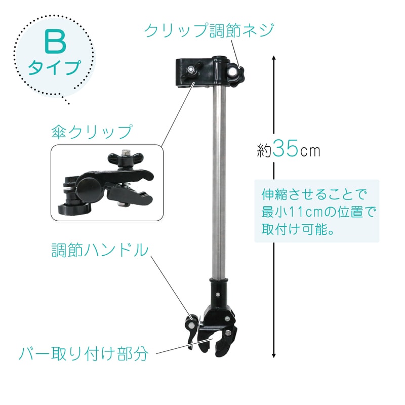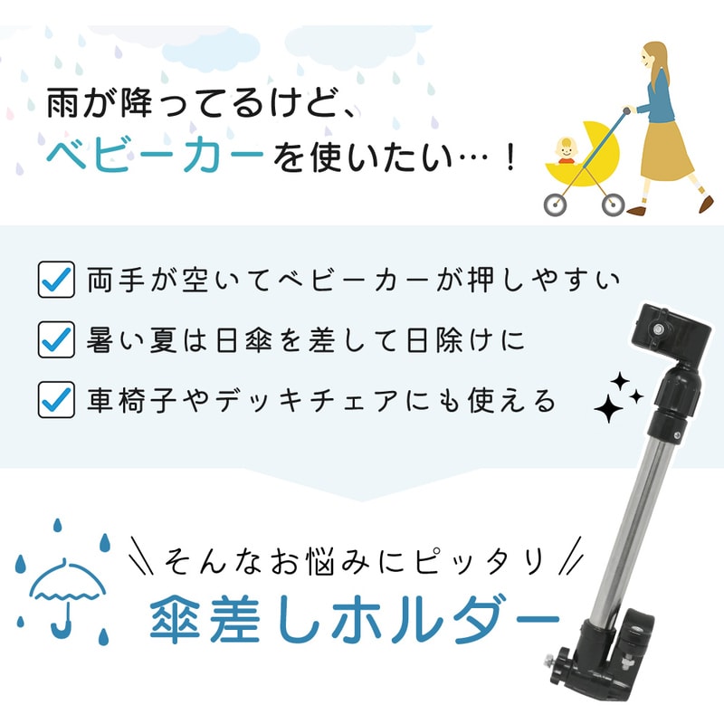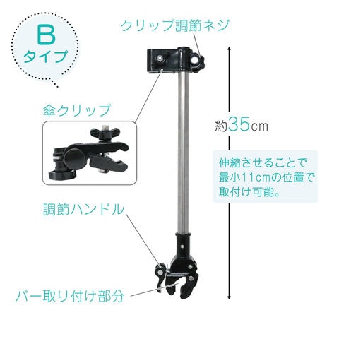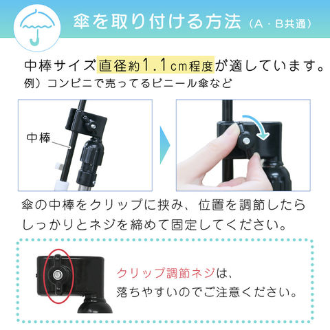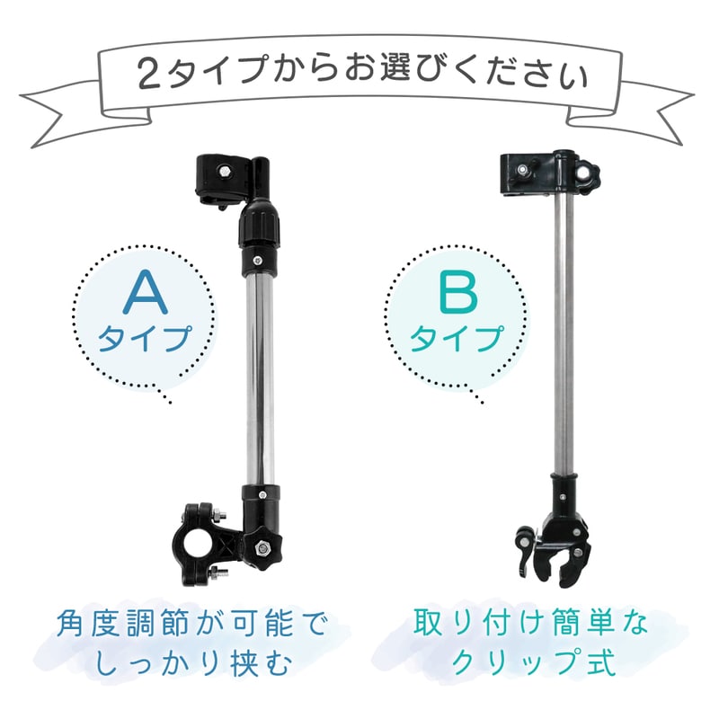 傘スタンド ベビーカー 傘ホルダー 傘立て 傘差しホルダー 日傘スタンド 傘固定 スタンド 車いす 車椅子 介護 キックボード 自転車 自転車用品 通勤 通学 チャリ 日除け 雨除け 角度調整 可能 紫外線対策 手押し車 シルバーカー コンパクト ママチャリ Bタイプ