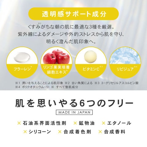 水、イソペンチルジオール、ソルビトール、グリセリン、ベタイン、ジグリセリン、セリン、グリシン、グルタミン酸、アラニン、リシン、プロリン、トレオニン、アルギニン、PCA-Na、ユビキノン、3-グリセリルアスコルビン酸、リンゴ果実培養細胞エキス、フラーレン、カルボキシメチルヒアルロン酸Na、ヒアルロン酸Na、加水分解ヒアルロン酸、ヒアルロン酸ヒドロキシプロピルトリモニウム、ヒドロキシプロピルメチルセルロース、ポリクオタニウム-51、アルニカ花エキス、セイヨウオトギリソウ花/葉/茎エキス、セイヨウキズタ葉/茎エキス、セイヨウトチノキ種子エキス、ソメイヨシノ葉エキス、ハマメリス葉エキス、ブドウ葉エキス、グレープフルーツ果皮油、ベルガモット果実油、トコフェロール、ジヒドロキシプロピルアルギニンHCl、(アクリレーツ/アクリル酸アルキル(C10-30))クロスポリマー、BG、PEG-20ソルビタンココエート、PPG-13デシルテトラデセス-24、PVP、キサンタンガム、マンニトール、レシチン、結晶セルロース、酸化鉄、水酸化K、フェノキシエタノール、プロピルパラベン、メチルパラベン