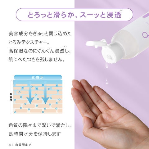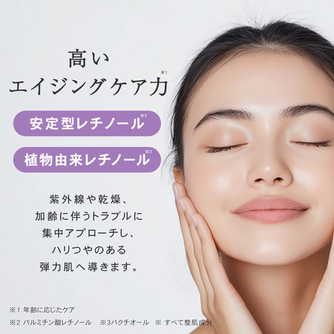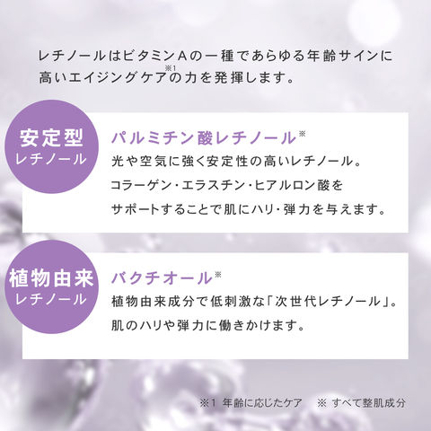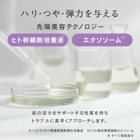 先端美容テクノロジーを駆使した美容液級の化粧水。ヒト幹細胞エクソソーム(※1)と安定型レチノール(※2)が、肌にハリ・つや・弾力を与えます。