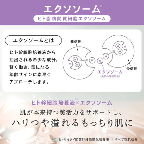 ※1 ヒト脂肪間質細胞エクソソーム、ヒトサイタイ間葉幹細胞順化培養液(整肌成分)