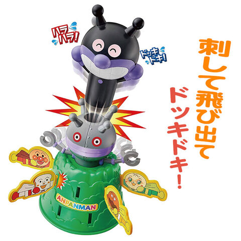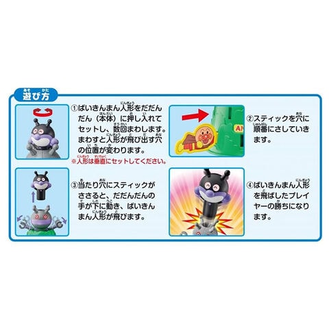 ● スティックを本体の穴に差し込み当たりの場所に差し込むと、ばいきんまん人形がポンッと飛び出すハラハラドキドキのゲーム!