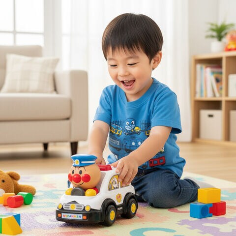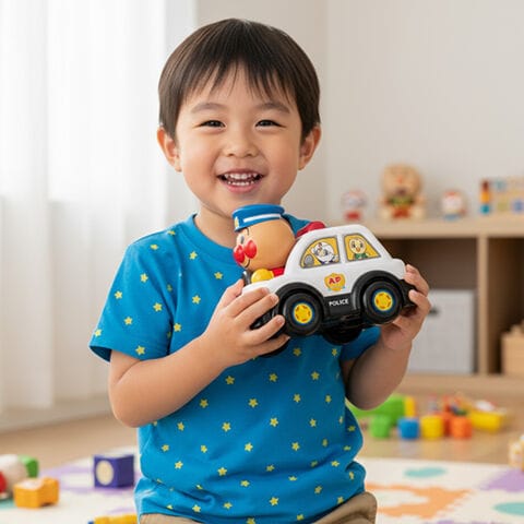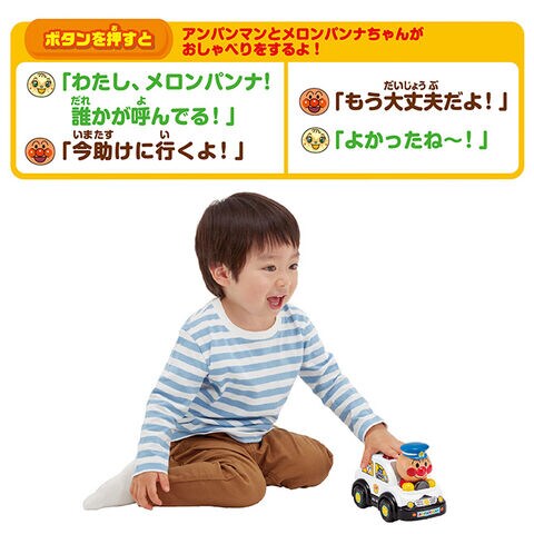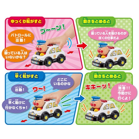 ●ゆっくり走らせると「パトロールに出動!」などのおしゃべりや走行音が流れ、速く走らせるとおしゃべりが変化し、サイレン音が鳴ってアンパンマンたちが助けに行くシチュエーション遊びができます。