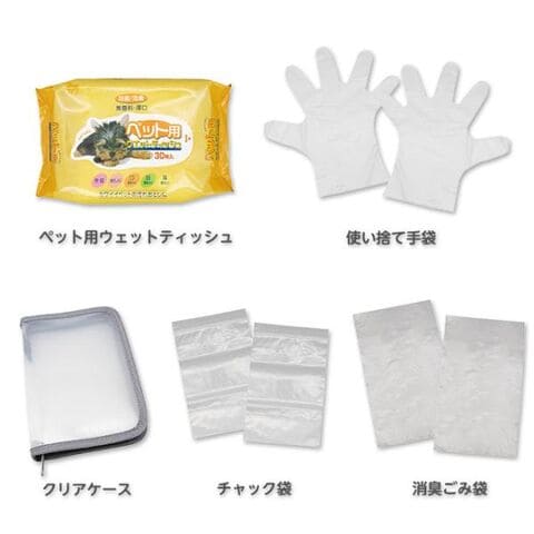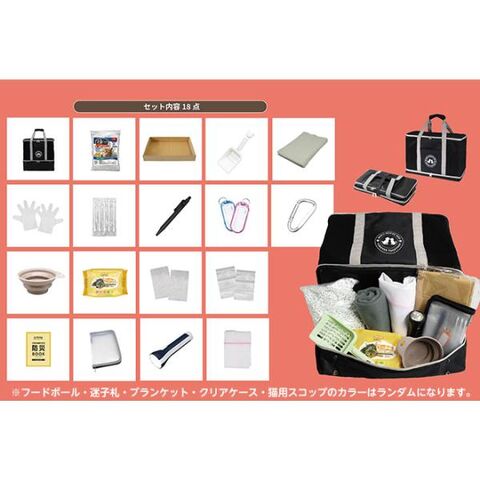■セット内容:キャリーバッグ、チャック袋、クリアケース、猫砂、猫用スコップ、コンパクトトイレ、フードボール、洗濯ネット、ブランケット、消臭ごみ袋、ペン、綿棒、迷子札、カラビナ、使い捨て手袋、2WAYライト、ペット用ウェットティッシュ、大事な家族を守る防災BOOK