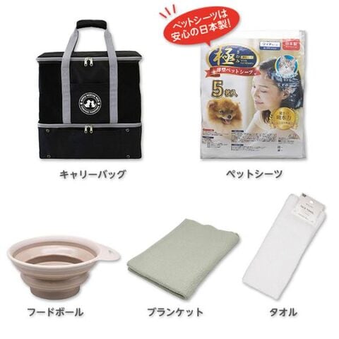 ■セット内容:キャリーバッグ、タオル、チャック袋、ガムテープ、フードボール、リード、ペットシーツ、ブランケット、クリアケース、消臭ごみ袋、ペン、綿棒、迷子札、カラビナ、使い捨て手袋、2WAYライト、ペット用ウェットティッシュ、大事な家族を守る防災BOOK
