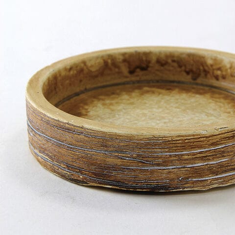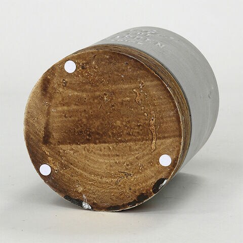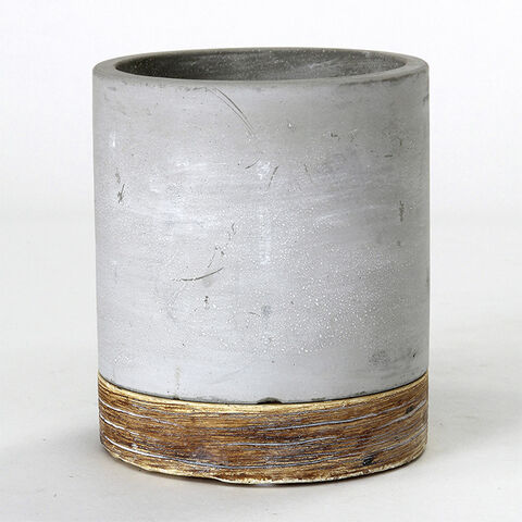■滑らかな質感のグレーポット本体と、木目のような加工を施したブラウンの受け皿をセットしたデザイン。