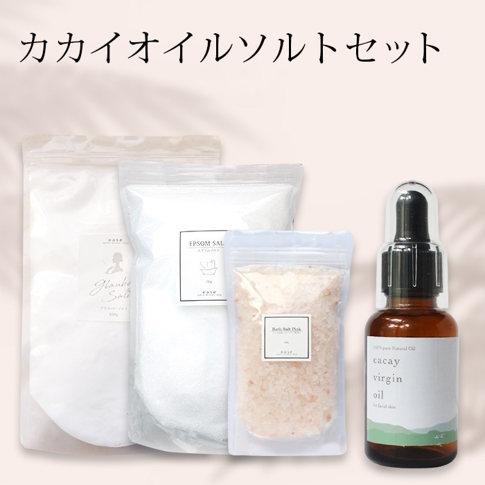 カカイオイルソルトセット(カカイバージンオイル 30ml、エプソムソルト 2kg、グラウバーソルト 800g、ピンクバスソルト500g) 精油 アロマ フェイス マッサージ 保湿 無添加 美容オイル ベースオイル スキンケア 入浴剤 国産 高純度 無香料 バスソルト バスタイム お風呂 浴用化粧品