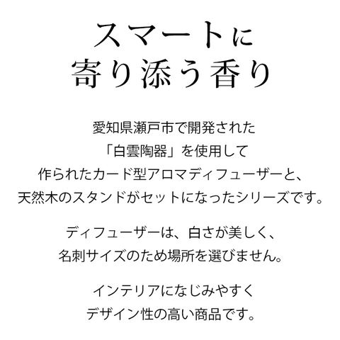 | 販売名 カードディフューザー 素材 陶器(日本製) 注意事項 ・職人が一つひとつ、手作業で作っているため、文字の位置がそろっていません。 ・木台は天然木のためそれぞれ模様や色が異なります。 ・陶器のため、落とすと割れてしまいます。取り扱いにお気をつけください。 ・お手持ちの名刺入れに名刺と共に携帯する場合、香りの成分によっては名刺に使われているインクを溶かしてしまう可能性がありますのでご注意下さい。 ・ 香りに色が付いているものは、プレートに染みうつります。染みが気になる場合は、プレートの裏面に香りの成分を垂らして下さい。 ・乳児、ペットの届かない場所に保管してください。 |