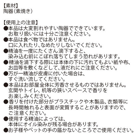![]() 商品名 アロマストーン MONO series 素材 陶器(素焼き) 注意事項 ・本品は大変割れやすい陶器でできています。お取り扱いには十分ご注意ください。 ・本品は食べ物ではありません。口に入れたり、なめたりしないでください。 ・精油を一度にたくさん滴下すると、染み込む前にこぼれ落ちてしまう恐れがあります。 ・精油を滴下する際には本体の下に汚れてもよい紙や布、お皿等を敷くなどして、液だれにご注意ください。 ・万が一精油が皮膚に付いた場合は、すぐ洗い流してください。 ・本品はお部屋全体に芳香させるものではありません。玄関やトイレ、机等の狭いスペースで香りをお楽しみください。 ・香りを付けた部分がプラスチックや木製品、衣類等に長時間触れると表面が変質することがありますので、ご注意ください。 ・使用する精油によっては、本体にオイル染みが残る場合があります。 ・お子様やペットの手の届かないところでご使用ください。 |