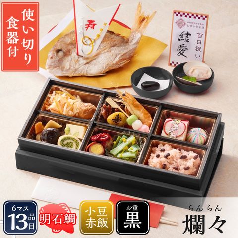| 内容量 | ●お食い初め重6マス([1] 日向夏紅白なます、[2]梅干し、[3]ピーカンナッツ飴炊き、[4]寿マロン、[5]ボイル海老、[6]三色だんご、[7]福寿栗きんとん、[8]てまり餅、[9]椎茸煮・うま煮、[10]揚げかま(枝豆チーズ)、[11]なごみ巻き(ほうれん草)、[12] たこ玉子、[13] 菊花くらくら和え) ●祝い鯛姿焼き(水揚げ時加工前400g / 下処理焼き加工後190g)×1 ●赤飯100g×1 ●蛤×1 ●お吸い物×1 ●歯固め石×1 ●祝箸×1 ●鯛飾り×1 ●敷き紙(白)×1 ●金紙×1 ●立札×1 ●お名前シール×1 ●使い切り食器×2 |