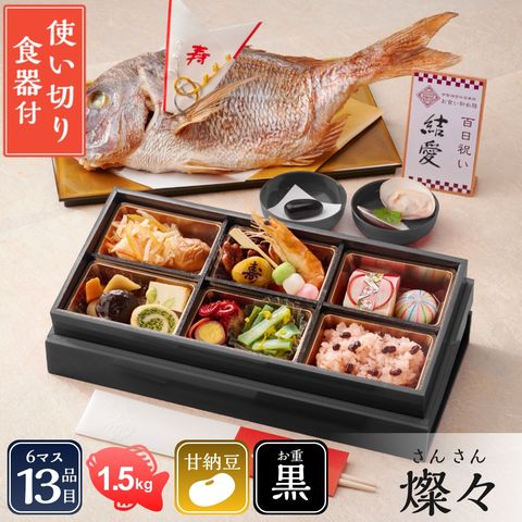| 内容量 | ●お食い初め重6マス([1] 日向夏紅白なます、[2]梅干し、[3]ピーカンナッツ飴炊き、[4]寿マロン、[5]ボイル海老、[6]三色だんご、[7]福寿栗きんとん、[8]てまり餅、[9]椎茸煮・うま煮、[10]揚げかま(枝豆チーズ)、[11]なごみ巻き(ほうれん草)、[12] たこ玉子、[13] 菊花くらくら和え) ●祝い鯛姿焼き(水揚げ時加工前1.5kg / 下処理焼き加工後800g)×1 ●赤飯100g×2 ●蛤×2 ●お吸い物×2 ●歯固め石×1 ●祝箸×2 ●鯛飾り×1 ●敷き紙(白)×1 ●金紙×1 ●立札×1 ●お名前シール×1 ●使い切り食器×2 |