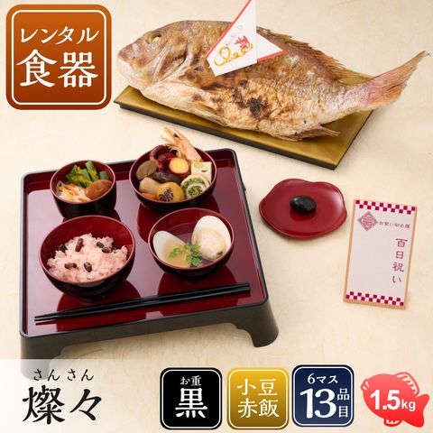 | 内容量 | ●お食い初め重6マス([1] 日向夏紅白なます、[2]梅干し、[3]ピーカンナッツ飴炊き、[4]寿マロン、[5]ボイル海老、[6]三色だんご、[7]福寿栗きんとん、[8]てまり餅、[9]椎茸煮・うま煮、[10]揚げかま(枝豆チーズ)、[11]なごみ巻き(ほうれん草)、[12] たこ玉子、[13] 菊花くらくら和え) ●祝い鯛姿焼き(水揚げ時加工前1.5kg / 下処理焼き加工後800g)×1 ●赤飯100g×2 ●蛤×2 ●お吸い物×2 ●歯固め石×1 ●祝箸×2 ●鯛飾り×1 ●敷き紙(白)×1 ●金紙×1 ●立札×1 ●お名前シール×1 ●お食い初め漆器セット(膳×1、椀×4(膳:W27.7×D27.7×H5.7cm、平椀:直径10×H4cm、飯椀:直径10×H5.8cm、汁椀:直径:9.2×H5cm、つぼ椀:直径:7.4×H5cm(ウレタン塗装))、箸×1(箸:22.5cm)) ●返却用運送会社の着払伝票×1 |