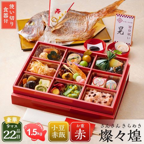 内容量 ●お食い初め重9マス([1]カニ菊花つみれ、[2]紅茶鴨スモーク、[3]松南瓜、[4]若桃甘露煮、[5]若鳥菜の花巻、[6]葉付金柑、[7]牛しぐれ笹包み、[8]花つつみ、[9]一口にしん昆布巻き、[10]日向夏紅白なます、[11]梅干し、[12]ピーカンナッツ飴炊き、[13]寿マロン、[14]ボイル海老、[15]三色だんご、[16]福寿栗きんとん、[17] てまり餅、[18] 椎茸煮・うま煮、[19] 揚げかま(枝豆チーズ)、[20] なごみ巻き(ほうれん草)、[21] たこ玉子、[22] 菊花くらくら和え)