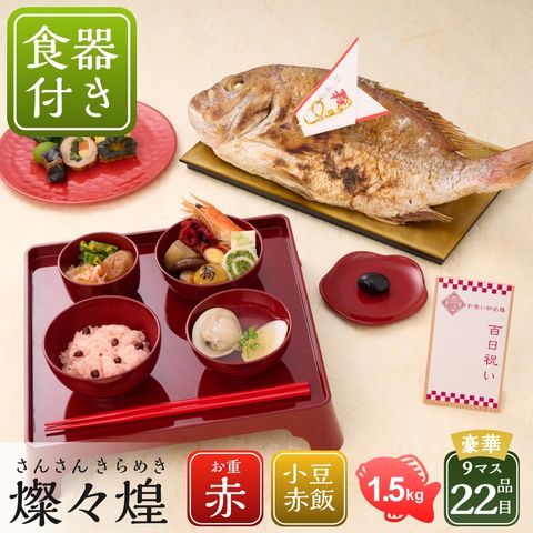 | 内容量 | ●お食い初め重9マス([1]カニ菊花つみれ、[2]紅茶鴨スモーク、[3]松南瓜、[4]若桃甘露煮、[5]若鳥菜の花巻、[6]葉付金柑、[7]牛しぐれ笹包み、[8]花つつみ、[9]一口にしん昆布巻き、[10]日向夏紅白なます、[11]梅干し、[12]ピーカンナッツ飴炊き、[13]寿マロン、[14]ボイル海老、[15]三色だんご、[16]福寿栗きんとん、[17] てまり餅、[18] 椎茸煮・うま煮、[19] 揚げかま(枝豆チーズ)、[20] なごみ巻き(ほうれん草)、[21] たこ玉子、[22] 菊花くらくら和え) ●祝い鯛姿焼き(水揚げ時加工前1.5kg / 下処理焼き加工後800g)×1 ●赤飯100g×2 ●蛤×2 ●お吸い物×2 ●歯固め石×1 ●祝箸×2 ●鯛飾り×1 ●敷き紙(白)×1 ●金紙×1 ●立札×1 ●お名前シール×1 ●お食い初め漆器セット(膳×1、椀×4(膳:W27.7×D27.7×H5.7cm、平椀:直径10×H4cm、飯椀:直径10×H5.8cm、汁椀:直径:9.2×H5cm、つぼ椀:直径:7.4×H5cm(ウレタン塗装))、箸×1(箸:22.5cm)) |