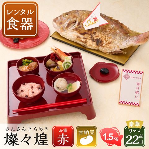 【リニューアル】【レンタル】 お食い初め 食器セット 【お食い初め膳 燦々 煌(さんさん きらめき)】最高級ブランド真鯛 赤飯 お吸い物 歯固めの石付 <豪華お料理17品> お食い初めセット やり方 メニュー 宅配