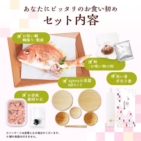 | 内容量 | ●祝い鯛姿焼き(水揚げ時加工前300g~400g/下処理焼き加工後150g~190g)×1 ●赤飯100g×1 ●蛤×1 ●お吸い物×1 ※吸い物はパッケージ白、銀どちらかをお届けいたします。 ●歯固め石×1 ●祝箸×1 ●鯛飾り×1 ●敷き紙(白)×1 ●agneyお食い初め食器セット(お椀(φ10×高さ 5cm 容量約120ml) ×2、お皿×3( 直径18・16・9cm)お箸×1膳 (16.5cm)) ギフトボックス入(サイズ:34×25×H8cm 重さ:約740g) |
