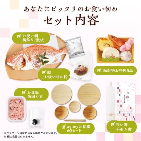 | 内容量 | ●祝い鯛姿焼き(水揚げ時加工前1.5kg / 下処理焼き加工後800g)×1 ●縁起物お料理5品([1]海老塩茹で、[2]チーズ伊達巻、[3]海老とアスパラのテリーヌ、[4]紅白むすび餅、[5]手まり餅) ●赤飯100g×1 ●蛤×1 ●お吸い物×1 ※吸い物はパッケージ白、銀どちらかをお届けいたします。 ●歯固め石×1 ●祝箸×1 ●鯛飾り×1 ●敷き紙(白)×1 ●agneyお食い初め食器セット(お椀(φ10×高さ 5cm 容量約120ml) ×2、お皿×3( 直径18・16・9cm)お箸×1膳 (16.5cm)) ギフトボックス入(サイズ:34×25×H8cm 重さ:約740g) |