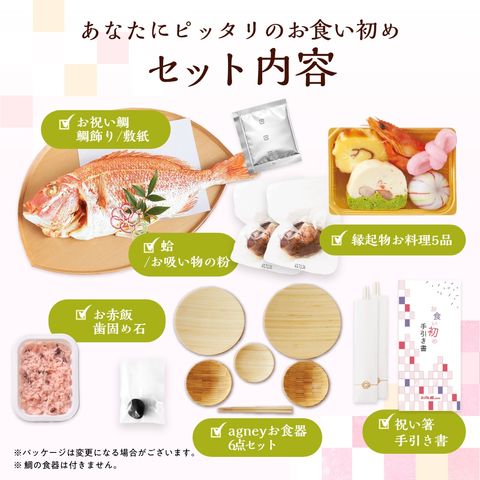 | 内容量 | ●祝い鯛姿焼き(水揚げ時加工前1.5kg / 下処理焼き加工後800g)×1 ●縁起物お料理5品([1]海老塩茹で、[2]チーズ伊達巻、[3]海老とアスパラのテリーヌ、[4]紅白むすび餅、[5]手まり餅) ●赤飯100g×2 ●蛤×2 ●お吸い物×2 ●歯固め石×1 ●祝箸×2 ●鯛飾り×1 ●敷き紙(白)×1 ●agneyお食い初め食器セット(お椀(φ10×高さ 5cm 容量約120ml) ×2、お皿×3( 直径18・16・9cm)お箸×1膳 (16.5cm)) ギフトボックス入(サイズ:34×25×H8cm 重さ:約740g) |