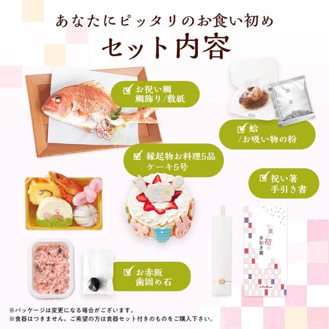 | 内容量 | ●祝い鯛姿焼き(水揚げ時加工前300g~400g/下処理焼き加工後150g~190g)×1 ●縁起物お料理5品([1]海老塩茹で、[2]チーズ伊達巻、[3]海老とアスパラのテリーヌ、[4]紅白むすび餅、[5]手まり餅) ●赤飯100g×1 ●蛤×1 ●お吸い物×1 ※吸い物はパッケージ白、銀どちらかをお届けいたします。 ●生クリーム5号ケーキ(直径約15cm)×1 ●アイシングクッキー8枚(スター×2、ナイフ×1、フォーク×1、ウサギ×1、クマ×1、ロンパース×1、100daysプレート×1) ●歯固め石×1 ●祝箸×1 ●鯛飾り×1 ●敷き紙(白)×1 |