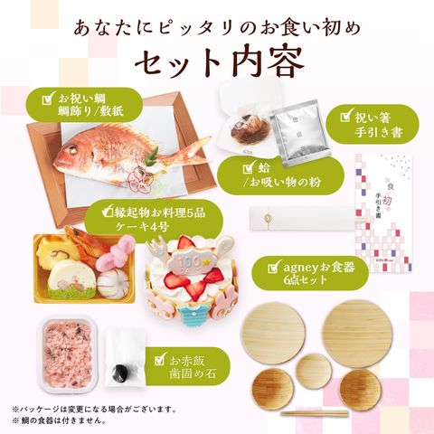 | 内容量 | ●祝い鯛姿焼き(水揚げ時加工前300g~400g/下処理焼き加工後150g~190g)×1 ●縁起物お料理5品([1]海老塩茹で、[2]チーズ伊達巻、[3]海老とアスパラのテリーヌ、[4]紅白むすび餅、[5]手まり餅) ●赤飯100g×1 ●蛤×1 ●お吸い物×1 ※吸い物はパッケージ白、銀どちらかをお届けいたします。 ●生クリーム4号ケーキ(直径約12cm)×1 ●アイシングクッキー8枚(スター×2、ナイフ×1、フォーク×1、ウサギ×1、クマ×1、ロンパース×1、100daysプレート×1) ●歯固め石×1 ●祝箸×1 ●鯛飾り×1 ●敷き紙(白)×1 ●agneyお食い初め食器セット(お椀(φ10×高さ 5cm 容量約120ml) ×2、お皿×3( 直径18・16・9cm)お箸×1膳 (16.5cm)) ギフトボックス入(サイズ:34×25×H8cm 重さ:約740g) |