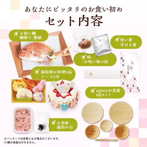 | 内容量 | ●祝い鯛姿焼き(水揚げ時加工前300g~400g/下処理焼き加工後150g~190g)×1 ●縁起物お料理5品([1]海老塩茹で、[2]チーズ伊達巻、[3]海老とアスパラのテリーヌ、[4]紅白むすび餅、[5]手まり餅) ●赤飯100g×1 ●蛤×1 ●お吸い物×1 ※吸い物はパッケージ白、銀どちらかをお届けいたします。 ●生クリーム5号ケーキ(直径約15cm)×1 ●アイシングクッキー8枚(スター×2、ナイフ×1、フォーク×1、ウサギ×1、クマ×1、ロンパース×1、100daysプレート×1) ●歯固め石×1 ●祝箸×1 ●鯛飾り×1 ●敷き紙(白)×1 ●agneyお食い初め食器セット(お椀(φ10×高さ 5cm 容量約120ml) ×2、お皿×3( 直径18・16・9cm)お箸×1膳 (16.5cm)) ギフトボックス入(サイズ:34×25×H8cm 重さ:約740g) |