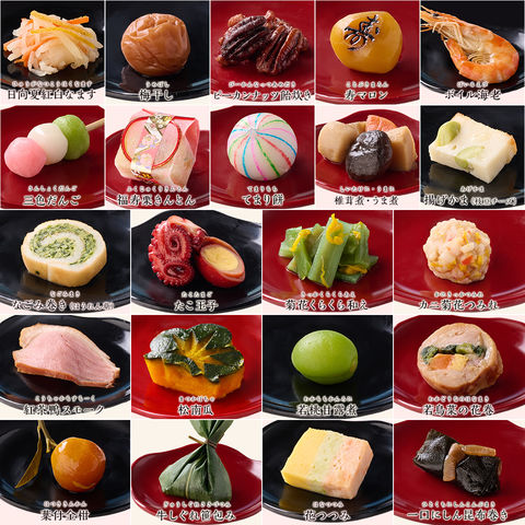 | 内容量 | ●お食い初め重9マス([1]カニ菊花つみれ、[2]紅茶鴨スモーク、[3]松南瓜、[4]若桃甘露煮、[5]若鳥菜の花巻、[6]葉付金柑、[7]牛しぐれ笹包み、[8]花つつみ、[9]一口にしん昆布巻き、[10]日向夏紅白なます、[11]梅干し、[12]ピーカンナッツ飴炊き、[13]寿マロン、[14]ボイル海老、[15]三色だんご、[16]福寿栗きんとん、[17] てまり餅、[18] 椎茸煮・うま煮、[19] 揚げかま(枝豆チーズ)、[20] なごみ巻き(ほうれん草)、[21] たこ玉子、[22] 菊花くらくら和え)