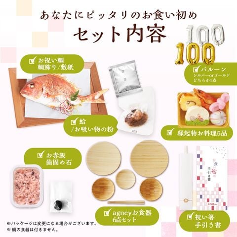 | 内容量 | ●祝い鯛姿焼き(水揚げ時加工前300g~400g/下処理焼き加工後150g~190g)×1 ●縁起物お料理5品([1]海老塩茹で、[2]チーズ伊達巻、[3]海老とアスパラのテリーヌ、[4]紅白むすび餅、[5]手まり餅) ●赤飯100g×1 ●蛤×1 ●お吸い物×1 ※吸い物はパッケージ白、銀どちらかをお届けいたします。 ●歯固め石×1 ●祝箸×1 ●鯛飾り×1 ●敷き紙(白)×1 ●agneyお食い初め食器セット(お椀(φ10×高さ 5cm 容量約120ml) ×2、お皿×3( 直径18・16・9cm)お箸×1膳 (16.5cm)) ギフトボックス入(サイズ:34×25×H8cm 重さ:約740g) ●100日バルーンセット(レターバルーン「1」×1、レターバルーン「0」×2、ストロー付き、サイズ:高さ約30cm) |