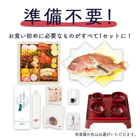 ●祝い鯛姿焼き(水揚げ時加工前1.5kg / 下処理焼き加工後800g)×1、●赤飯100g×1、●蛤×1、●お吸い物×1、●歯固め石×1、●祝箸×1、●鯛飾り×1、●敷き紙×1、●風呂敷x1 ●膳×1、椀×4(膳:W27.7×D27.7×H5.7cm、平椀:直径10×H4cm、飯椀:直径10×H5.8cm、汁椀:直径:9.2×H5cm、つぼ椀:直径:7.4×H5cm(ウレタン塗装))、箸×1( 箸:22.5cm(ポリエステル塗装)) ●箱(28×28×6cm) |
