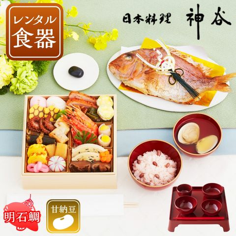 日本料理神谷監修お食い初め膳 祝い鯛姿焼きコース(1段重) ●明石鯛 ●甘納豆赤飯●レンタル食器付(男の子用)