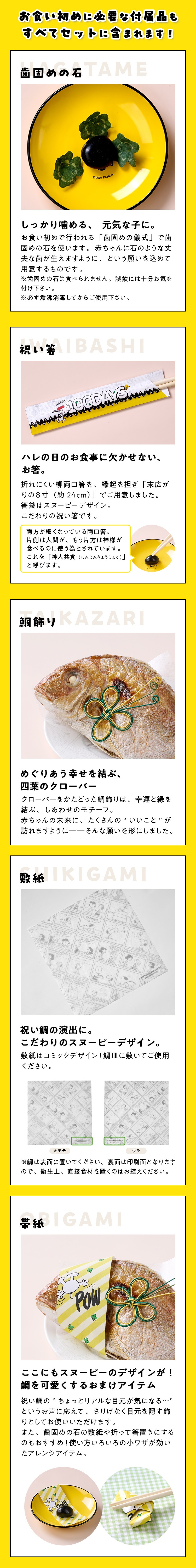 【GOODDAY】 ・お食い初め食器5点 ・祝い鯛姿焼き 200~250g×1 (水揚げ時加工前200?250g/下処理焼き加工後90?150g) ・蛤×1 ・お吸い物の素×1 ・祝い箸×1 ・歯固めの石×1 ・敷紙×1 ・鯛飾り×1 ・帯紙×1 ・紙エプロン×1 ・お食い初めの手引書×1 |