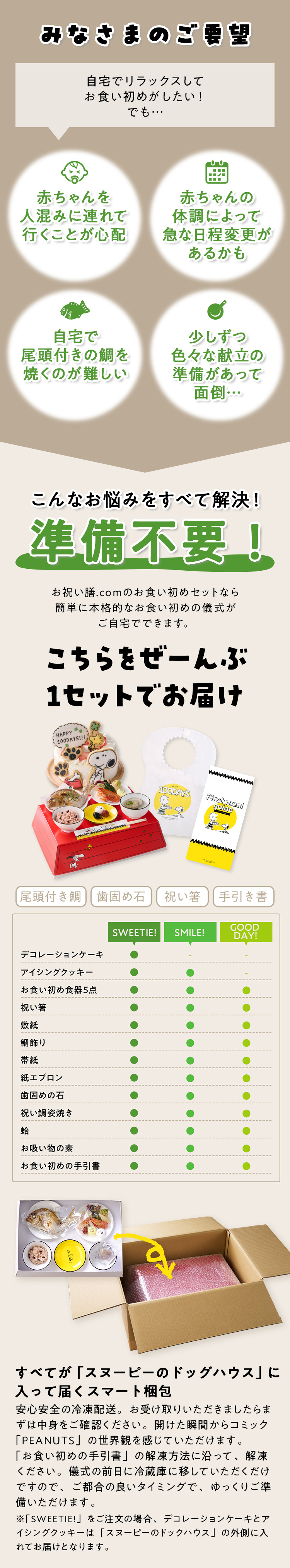 【SMILE! 】クッキー付き ・お食い初め食器5点 ・祝い鯛姿焼き 200~250g×1 (水揚げ時加工前 200~250g/下処理焼き加工後90~150g) ・蛤×1 ・お吸い物の素×1 ・アイシングクッキー×1 ・祝い箸×1 ・歯固めの石×1 ・敷紙×1 ・鯛飾り×1 ・帯紙×1 ・紙エプロン×1 ・お食い初めの手引書×1 |