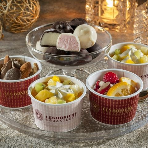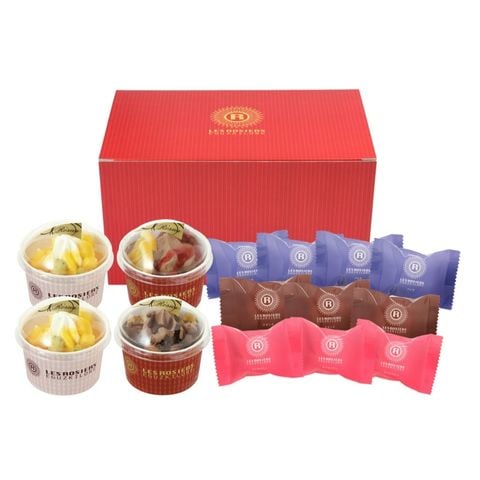 口どけのよいクリームをバニラとチョコ2種類のアイスの上に絞り、素材感あふれるフルーツとミックスナッツを贅沢にトッピングしたアイスと、バニラ・クランチ・ストロベリーの3種類が楽しめる、一口サイズのアイスとのセットです。