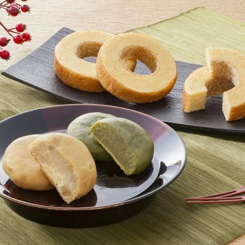 和三盆の上品な甘みが引き立つバウムクーヘンと、しっとり柔らかで風味豊かな抹茶とくるみの2種類のミルク饅頭を詰合せました。
