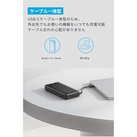 USB-Cケーブル一体型のため、外出先でもお使いの機器をいつでも充電可能。ケーブル忘れの心配がありません。