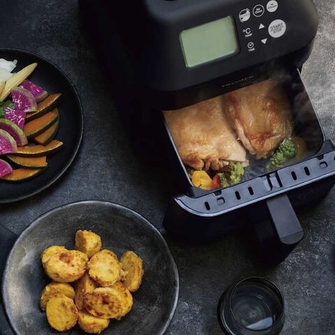 大量のスチームと高温の熱風を大型ファンで循環させる「ハイスチームエアーオーブン」調理家電種類:ハイスチームエアーオーブン 消費電力:1200 W 幅x高さx奥行:230x285x370 mm 重量:4.8 kg