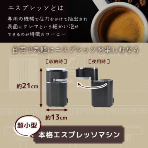タイプ:エスプレッソ式 容量:1 杯 抽出時気圧:9 気圧 タンク容量:150 ml 最大使用水量:0.15 L 消費電力:350W 電源コードの長さ:0.9 m エスプレッソ:○ 液晶パネル:○ 本体サイズ(外形寸法):展開時:幅90x高さ213x奥行206mm 質量:1.2kg カラー:ブラック系