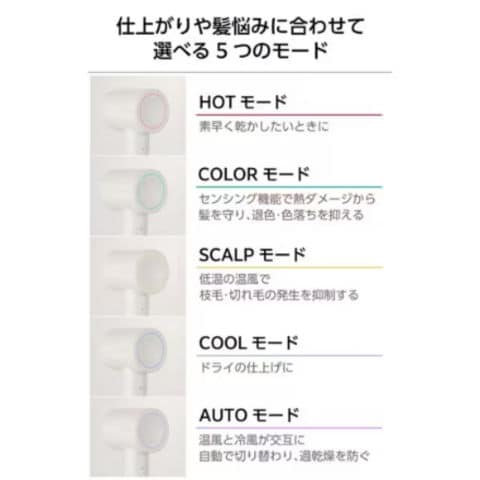種類:ヘアドライヤー 風量:0.8m3/分(JIS規格)(TURBO-HOT使用時) 温風温度:100℃(周囲温度30℃の場合。TURBO-HOT使用時) 風温切替機能:○ 自動温度調節機能:○ マイナスイオン:○ イオン名称:マイナスイオン 冷風:○ スカルプモード:○ 電源・電圧:AC100V 50/60Hz コードの長さ:1.7 m 消費電力:1300W サイズ:幅88x高さ261x奥行70mm(本体のみ)/幅144x高さ295x奥行136mm(ディフューザー付き) 重量:475g(本体のみ/電源コード含む)/615g(ディフューザー付き/電源コード含む) カラー:ホワイト 付属ブラシ数/アタッチメント数:2 個 付属ブラシ/アタッチメント:セットフード/ディフューザー