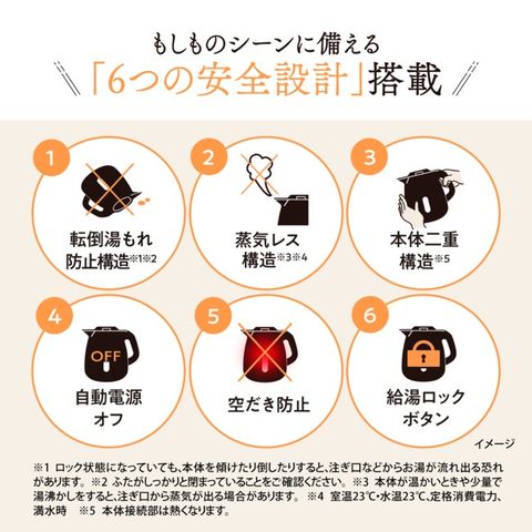 タイプ:電気ケトル 容量*1:1 L 沸騰時間*4:カップ1杯(140ml):約60秒満水:約5分(室温・水温23℃、定格消費電力で沸かした場合) 保温機能:1段階(90℃) 保温時間:60 分 注ぎ口形状:三角口 電源コード:1.3 m 湯沸し時消費電力:1300 W 消費電力:1300W 目盛付き窓:○ 蒸気レス:○ 転倒湯漏れ防止:○ 空焚き防止:○ 二重構造:○ コードレス出湯:○ カルキ抜き機能:○ 蓋の取り外し:○ サイズ:250x220x160(本体のみ)250x235x160(電源プレート含む) mm 重さ:1.1 kg カラー:スレートブラック