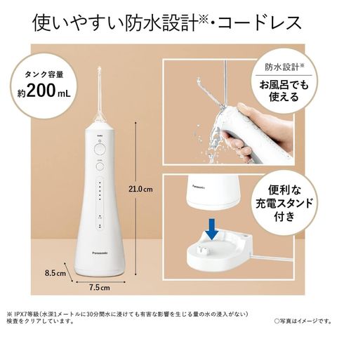 タイプ:口腔洗浄器 バッテリー:充電 連続稼働時間:10 分 本体丸洗い:○ 主な機能:水流洗浄音波振動強弱切り替え 対応電圧:AC100-240V 充電時間:フル充電:約1時間 付属品:超音波水流ノズル1本、ポイント磨きノズル1本、舌磨きノズル1本 本体寸法:幅7.5x高さ31x奥行8.5cm(舌磨きノズル含む) 重量:276 g
