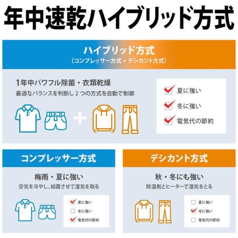 タイプ:衣類乾燥除湿機 除湿方式:ハイブリッド式 タンク容量:3.6 L 除湿能力:木造:15/16畳(50/60Hz)鉄筋:30/33畳(50/60Hz) 1日あたりの除湿能力:12 L 消費電力:除湿時:305W(標準)衣類乾燥時:室温27℃:695W/室温30℃:665W(速乾) 運転音:除湿:(標準)49/49dB、(音控えめ)37/37dB(50Hz/60Hz)衣類乾燥:(速乾・標準)49/49dB、(音控えめ)37/37dB(50Hz/60Hz) 電源コード長さ:1.8 m キャスター:4輪〈横移動のみ〉 除菌:○ 消臭:○ 内部乾燥:○ スポット乾燥:○ 送風:左右ワイドスイング(約165cm)/上下広角スイング/下向き/上向き/前方 衣類乾燥時間:約57分(梅雨時)約75分(冬季) イオン:プラズマクラスター 自動停止機能:○ 連続排水:○ タイマー:切タイマー(1~9時間) チャイルドロック:○ 温度センサー:○ 湿度センサー:○ 幅x高さx奥行き:365x645x235 mm 重さ:15 kg