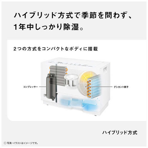 タイプ:衣類乾燥除湿機 除湿方式:ハイブリッド式 タンク容量:2.4 L 除湿能力:木造:8/8畳(50/60Hz)鉄筋:15/16畳(50/60Hz) 1日あたりの除湿能力:6 L 消費電力:除湿運転:強:170W/自動・弱:165W衣類乾燥運転:標準:170W/速乾:535W/冬・音ひかえめ:165W 運転音:除湿:(強)49/49dB、(自動・弱)43/43dB(50Hz/60Hz)衣類乾燥:(速乾・標準)49/49dB、(冬・音ひかえめ)43/43dB(50Hz/60Hz) 電源コード長さ:2.1 m キャスター:4輪キャスター 除菌:○ 内部乾燥:○ 衣類乾燥:冬モード 送風:上下約100cmワイド送風 衣類乾燥時間:標準:約152分音ひかえめ・冬:約196分速乾:約97分 イオン:ナノイーX 自動停止機能:○ タイマー:切タイマー:2・4・6時間後 温度センサー:○ 湿度センサー:○ 幅x高さx奥行き:470x335x250 mm 重さ:10.5 kg