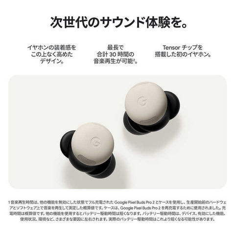 Google Pixel Buds Pro 2 は、イヤホンの装着感をさらに高めたデザインで、耳にぴったりフィット。初の Google Tensor チップを組み込んだ、Google の AI を搭載したイヤホンです。 通信方式:Bluetooth 5.4 ドライバ:専用の 11 mm ダイナミック スピーカー ドライバ ノイズキャンセリング:Silent Seal2.0 を使用したアクティブ ノイズ キャンセリング 外部音取り込み:外部音取り込みモード マイク:風の音を軽減するメッシュカバー センサー:音楽、通話、Google アシスタントの操作に対応した静電容量方式タッチセンサー(タップとスワイプ)、IR 近接センサーによりイヤホンの着脱を検知し、自動で再生 / 一時停止、加速度計とジャイロスコープによるモーション検出 防水性能:イヤホン本体: IPX5.4、ケース: IPX4 バッテリー:アクティブ ノイズ キャンセリングがオフの場合、音楽再生可能時間はイヤホンのみで最長 12 時間、充電ケース併用時は合計で最長 48 時間です。アクティブ ノイズ キャンセリングがオンの場合、音楽再生可能時間はイヤホンのみで最長 8 時間、充電ケース併用時は合計で最長 30 時間です。アクティブ ノイズ キャンセリングがオフの場合、充電ケースにイヤホンを入れて 5 分間充電すると、最長 1.5 時間の音楽再生が可能です。 サイズ:イヤフォン:2.74 mm x 23.08 mm x 17.03 mm、充電ケース:25.0 mm x 49.9 mm x 63.3 mm 重量:左右の各イヤホン:4.7 g(M サイズのイヤーチップ使用時)6.2 g(中サイズのイヤーチップ使用時)、充電ケース:62.4 g(イヤフォンを入れた状態)、充電ケース:65.0 g(イヤホンを含む) 同梱品:イヤホン、ワイヤレス充電ケース、4 サイズのイヤーチップ: XS、S、M、L(M サイズはイヤホンに装着済み)、クイック スタートガイド すべての機能を利用するための要件:Bluetooth 4.0 以降に対応した Android および iOS デバイス、タブレット、ノートパソコンなどとのペア設定が可能。Google アカウント、Google アシスタント対応スマートフォン(Android 6.0 以降)、インターネット接続