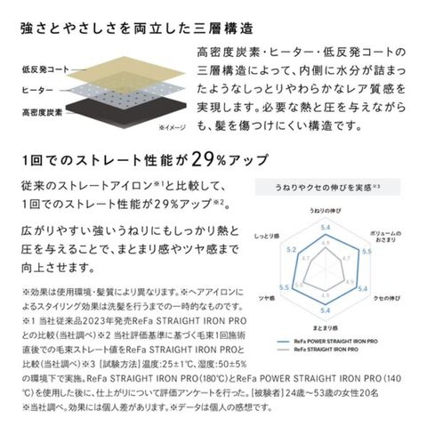 独自開発の38mm幅広カーボンレイヤープレートを採用したストレートヘアアイロン。水・熱・圧によるダメージを抑えながら、うねりを整える。