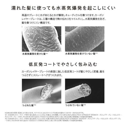 カーボンレイヤープレートの表面に施した低反発コートが髪にやさしく密着。髪をつぶさずにストレートヘアがつくれる。