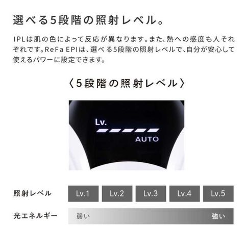 選べる5段階の照射レベルで、自分が安心して使えるパワーに設定できる。