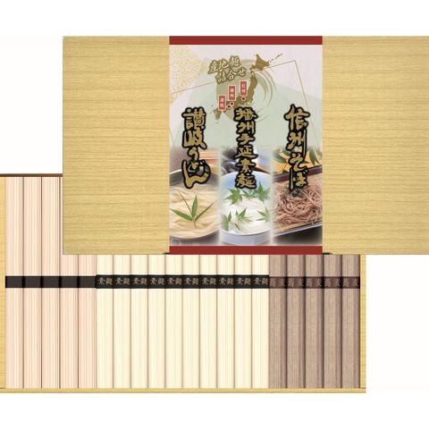 日本を代表する播州手延素麺・信州そば・讃岐うどんの贅沢な詰合せです。コシの強い播州手延素麺、なめらかな喉越しの信州そば、モチモチとした食感の讃岐うどんの食べ比べをお楽しみください。\n