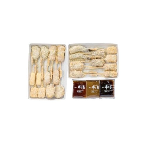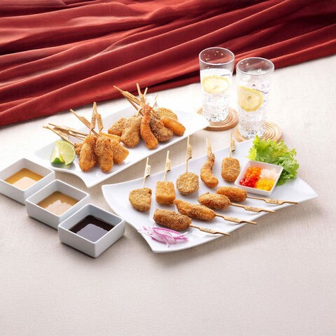 串揚げ9種 計22串 (海老×2、洋風蒸し×4、ポークヒレ×2、鶏むね肉白葱×4、神戸牛×2、羽衣チーズ×2、鳴門金時×2、射込蓮根×2、ポークロール×2)、特製タレ3種各×1(濃黒タレ、和風タレ、洋風タレ)