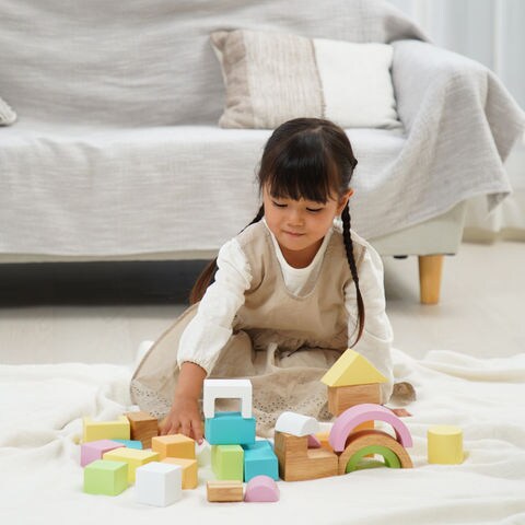 小さなお手てにも伝わるやさしい木のぬくもり。思わず手に取りたくなるポップな色合いで、ベビーのプレイタイムをかわいく演出します。