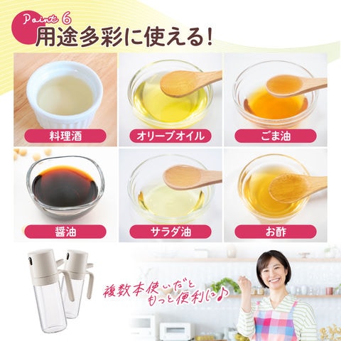 料理酒、オリーブオイル、醤油、サラダ油、お酢、ごま油など